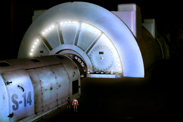 The Doctor, Robyn and K9 exited the TARDIS and looked around. The Doctor recognised that this was the hold of a small freighter, although it looked very much like the ship had been extensively modified to incorporate weaponry. They decided to explore further.