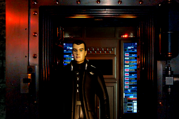 Timor and his first mate, Hadi, were walking down a corridor towards the mess when they saw the Doctor, Robyn and K9. He pulled his blaster from his side and pointed it at the strangers. The Doctor appeared both charming and disarming, but Timor had spent too many long years fighting in guerrilla wars to have much trust left in him. He demanded that the strangers were taken into custody. Robyn rolled her eyes and tutted at the Doctor.