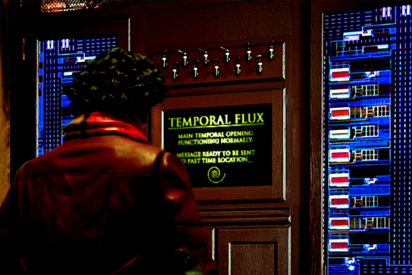 The Doctor read of the plan to disable the Seventh Fleet, but the plan had failed. Timor felt that the Seventh Fleet were warned by spies, but they had not uncovered the source onboard the ship. Robyn realised that they could have been warned by someone – someone from the future. The Doctor thought that there could be evidence to back this up. The TARDIS readings had shown that the trigger for the chronon flux was a very small temporal distortion. This could have been a message as it occurred ten seconds prior to the withdrawal of the seventh fleet, and K9 agreed with this hypothesis, though with a few technical corrections. Timor realised the implications of this – his plan succeeded initially but the timeline changed to prepare the Seventh Fleet for it.