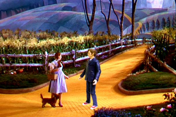 The time travellers look at the screen so see Dorothy, the Lion, the Scarecrow and the Tin Man merrily dancing down the Yellow Brick Road through the Land of Oz...