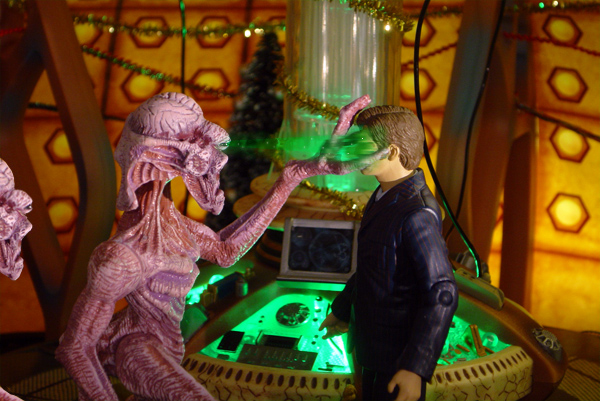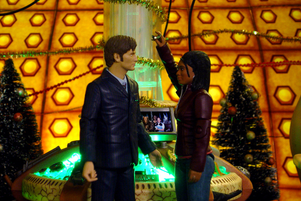 Soon after, the Doctor and Martha are sitting in the TARDIS. Martha is putting some baubles on the tree. The Doctor says that the TARDIS could have done that, but Martha says it needs her touch! The TARDIS’s taste is a bit … old fashioned. ‘See what your fashion taste is like when you’re over 1000!’ replies the Doctor. Martha asks what happened to the D’Akora. The Doctor explains that the D’Akora exist in another dimension and are attracted to sources of psychic energy, just like the TARDIS. Inside the TARDIS he could defeat them, but he says that outside it’s a different matter. He hopes they don’t meet them again. Martha asks whether the Celestial Toymaker will try to trap the Doctor again. The Doctor says that the Toymaker has faded from time and space. The trap was a last chance for revenge. And it would have worked if it wasn’t for Martha! ‘And some friends…’ Martha adds.