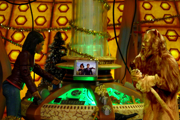 Martha walks into the console room and catches her breath. It looks like Santa’s grotto. Well, more like Santa’s grotto, she should say. The Doctor has reprogrammed the TARDIS to display Christmas decorations, but in true Doctor style, it’s really overboard. Lights, baubles and tinsel everywhere! But no Doctor. Maybe he’s popped out to get her some Christmas presents. No, hang on; someone is crouched behind the console. She walks round to see … a lion? But not just any lion – the Cowardly Lion from the Wizard of Oz. And he’s scared.