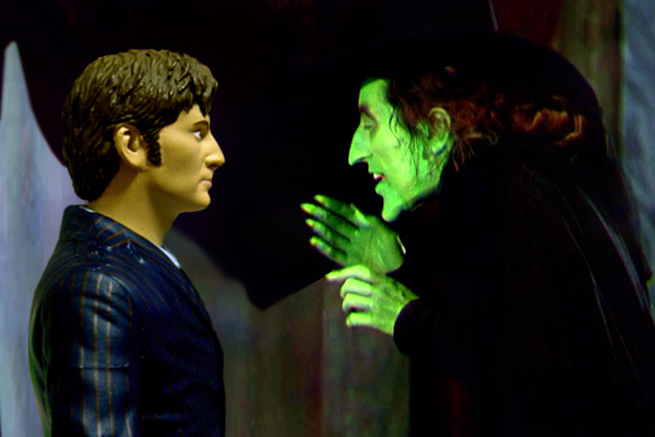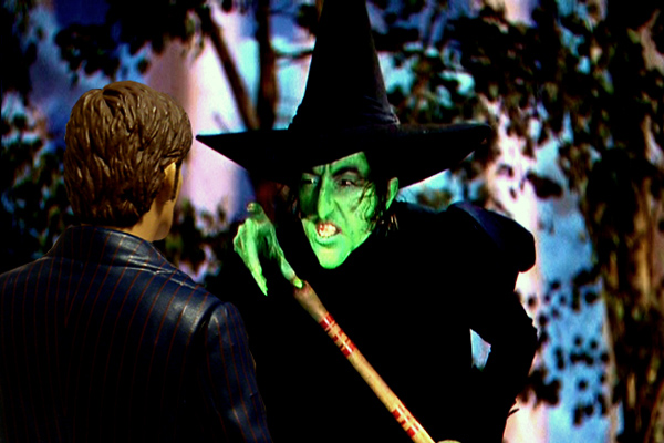 The Doctor feels a sharp pain in his backside and spins around to see the Wicked Witch of the West. ‘Oh,’ he grins. ‘I’ve always wanted to meet you!’ giving her a peck on the cheek. The Doctor is thrown back violently by a wave of energy, tumbling him to the floor. She says that she has waited for the Doctor for a long time. The Doctor suddenly realises that the Witch is more than just another character. There’s something very dangerous about her. She says that this is revenge from her master, an old adversary the Doctor should never have crossed. The Doctor asks her for a clue as to exactly which one, but his joke is lost on her. She has a challenge for him. He needs to get his companions to the Emerald City – simple really. But there is a catch – he is now a character here too, and can die just as easily as any other. It makes no difference how he thinks it ends – anything can happen. The Doctor has fallen silent, and Martha tries to talk to him, but he can’t hear. The Witch has blocked him from talking to outside the film.