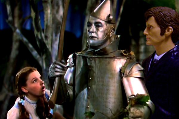 The Doctor has managed to get Dorothy and the Scarecrow to loosen up the Tin Man. He has used the sonic screwdriver to disintegrate the rust that has frozen him, saying that they don’t have time to use the oil can. He says that they can now make their way towards the Emerald City, so that Dorothy can get back to Kansas, the Scarecrow can get a brain, well a diploma, and the Tin Man a heart! And he can get face-to-face with whoever has trapped him here. His face turns from a look of thunder to a smile as he says to his companions that they need to follow the Yellow Brick Road. ‘And watch out for flying monkeys!’ he adds.