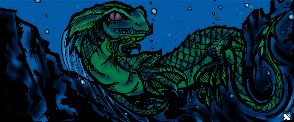 slanted eyes widened with shock. Racing through the water was a scaled