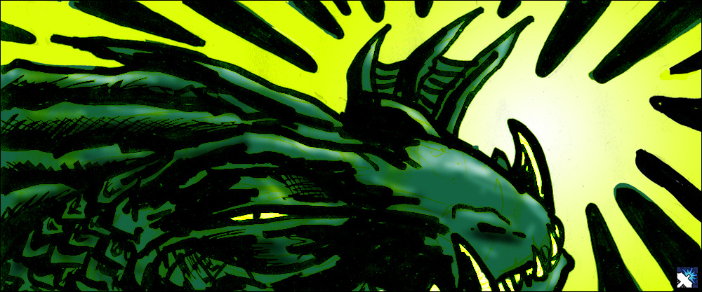 time with a flashing red eye extending from the top of his scaly head.